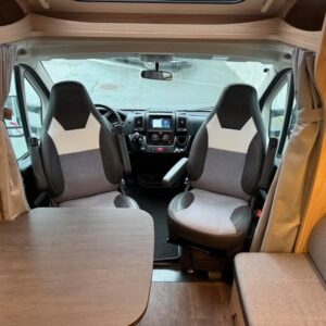 La disposition de celui-ci est de 2 lits simples avec un grand garage en dessous, une grande salle de bain avec douche, un canapé d’angle avec table réglable et un grand et bon lit pavillon devant au-dessus des sièges pilote.